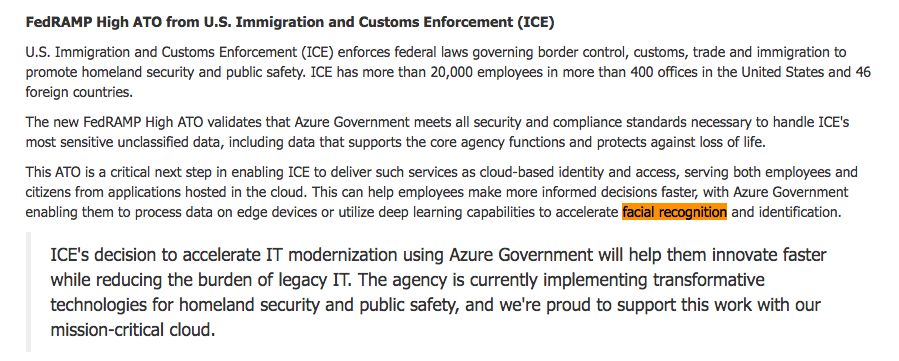 今年1月,微软在官方博客上宣布了与美国移民和海关执法局(U.S. Immigration and Customs Enforcement,简称 ICE)合作,微软通过政府云服务(Azure Government)跟 ICE 合作。比如,能够让执法局员工决策更快,更好地处理数据,或者利用深度学习功能加速面部识别和身份识别。