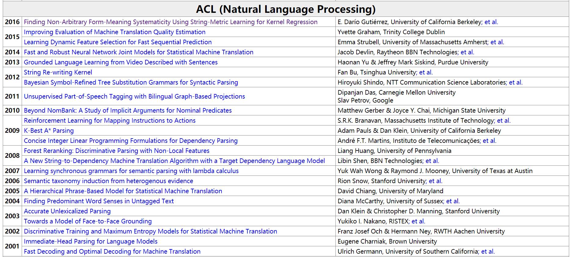 上图是 jeffhuang 统计的历届 ACL 最佳论文清单,可以看到,华人第一次获奖要追溯到 2008 年,而国内的论文获奖则是在 2012 年。