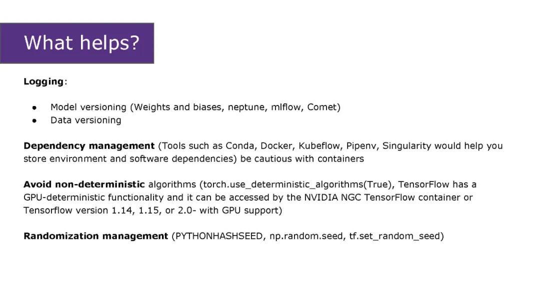 避免非确定性算法(torch.use_deterministic_algorithms(True), TensorFlow具有GPU确定性功能,它可以被NVIDIA NGC TensorFlow容器或TensorFlow版本1.14,1.15或2.0访问,并支持GPU)