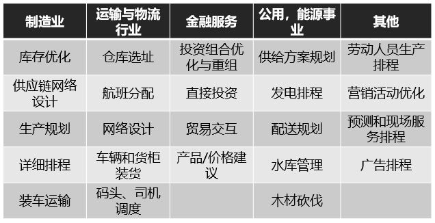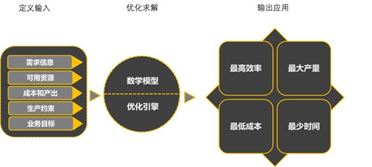 输出应用:通过对问题的求解,根据实际问题的形式,我们将获得一个经过优化的计划或排程。现在解释性分析已经应用在如制造、运输、物流、金融服务、政府公用事业等各个领域。