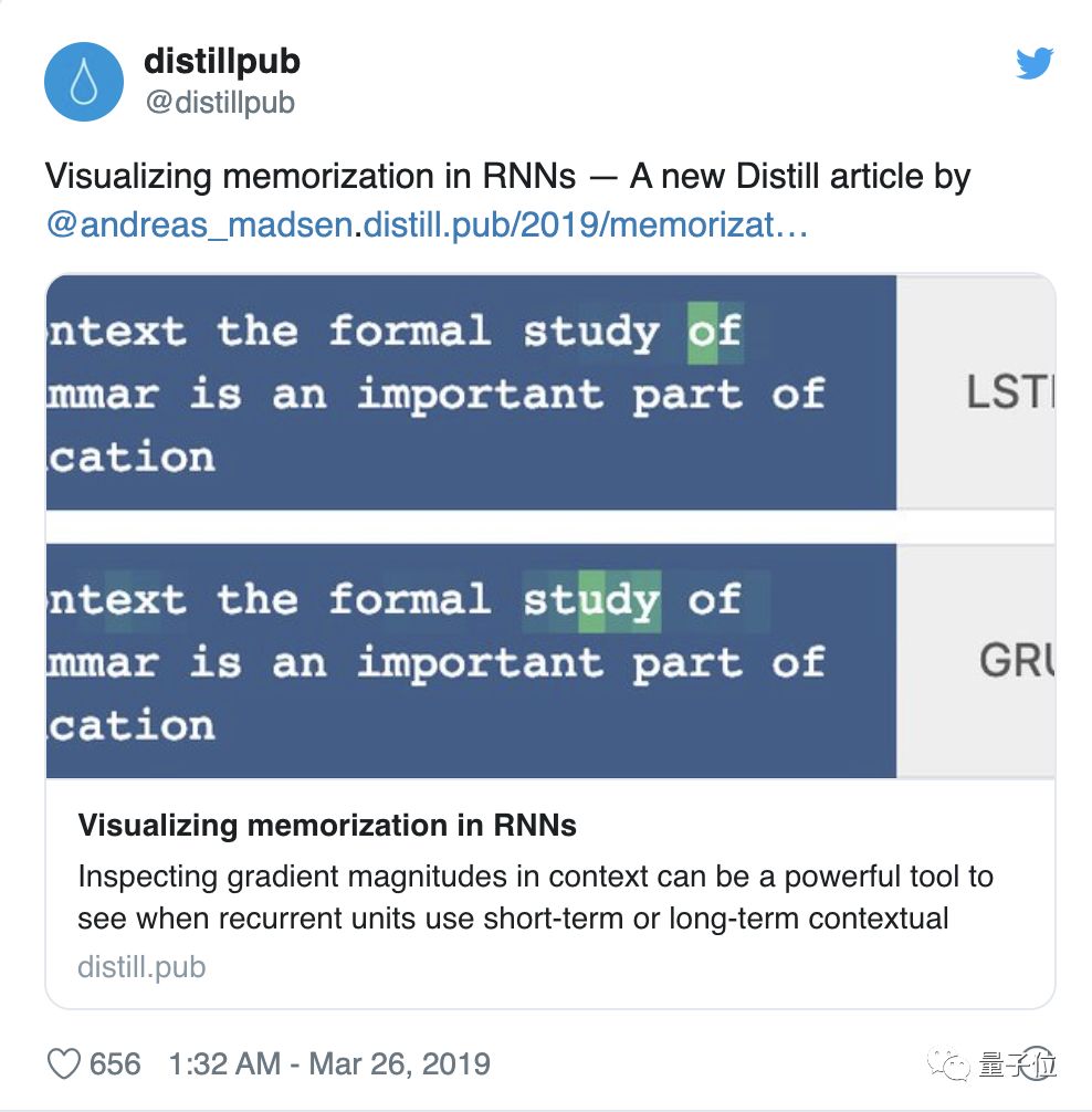 他以唯一作者的身份在distill.pub上发表了论文《在RNN中的可视化记忆》,展示了两个准确度相似的模型在NLP的显著交互可视性有很大不同。