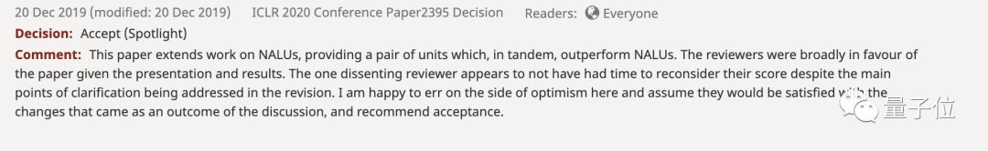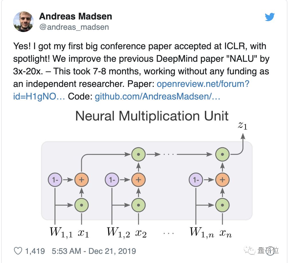 将实验设定和复现结果投给了 NeurlIPS 2019的SEDL workshop。然后他发了一条twitter,标记了NALU的第一作者A. Trask,结果对方回复了:Great work! 有了好的基准,才能继续提升。