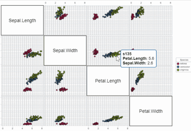 二维矩阵散点图展示多条件或因子数据的相关性,点选显示坐标数据