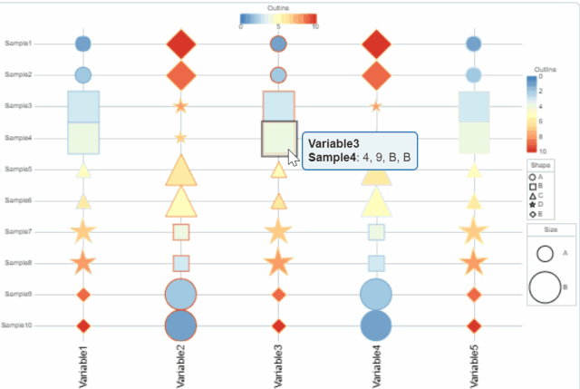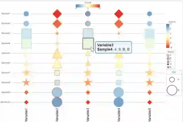 四个矩阵绘制的热图,分别代表图中颜色、边框颜色、形状和大小,鼠标悬停显示属性值