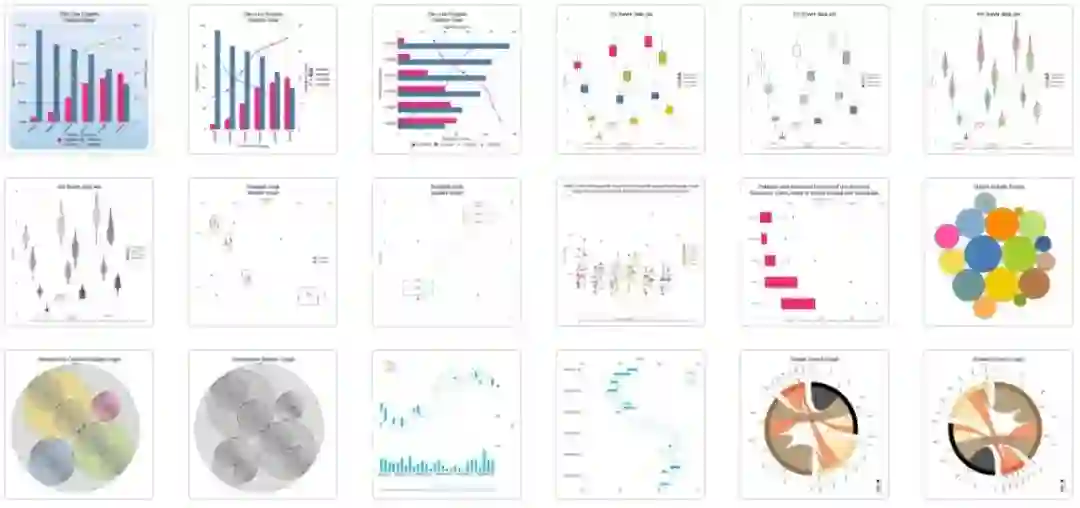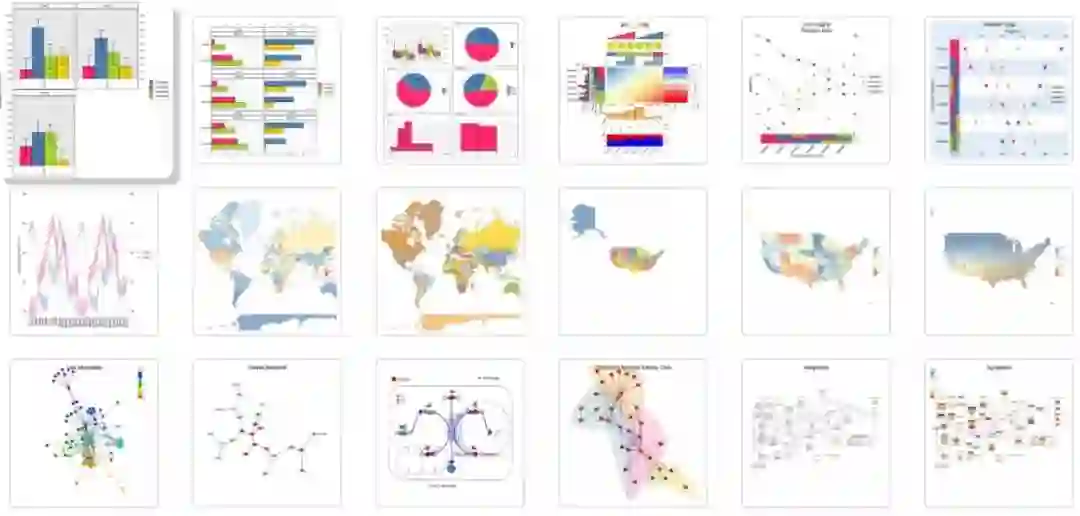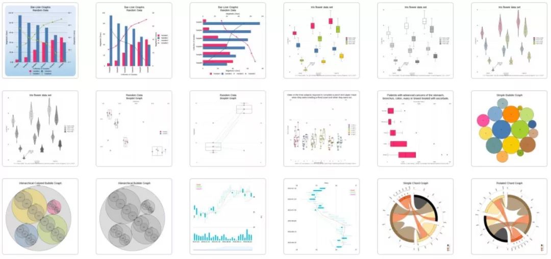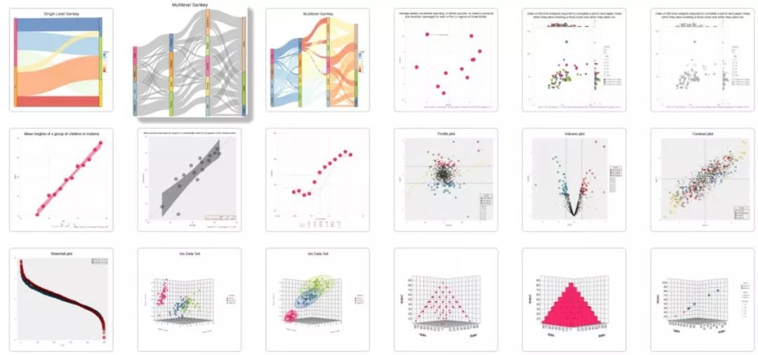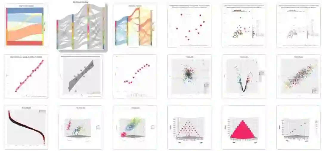 在R中可以安装canvasXpress包,使用canvasXpress命令绘制各种各样的交互式图形,非常高效方便,实现如下数百种图形,令你的结果瞬间B格爆满。