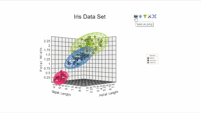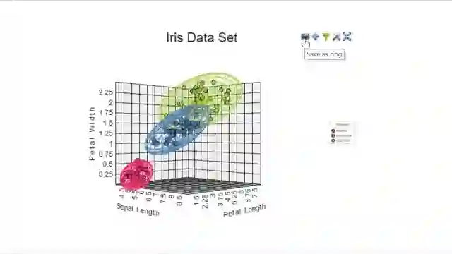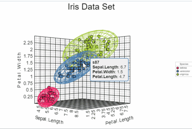 看到按分组绘制了三维散点图,而且添加了分组颜色和椭球形置信区间,我们可以鼠标托动变换角度,也可点选查看点的坐标