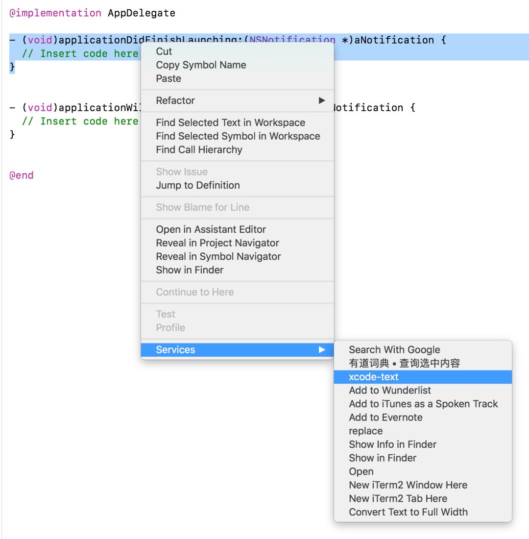 所有创建保存之后的 service 都会自动保存到 ~/Library/Services/ 目录下,一旦保存我们就可以在应用的 services 目录下看到我们的目标,比如我保存 xcode-text.workflow 之后。我在 Xcode 中选择某些代码,右键就可以看到我所创建的 service 了,如图: