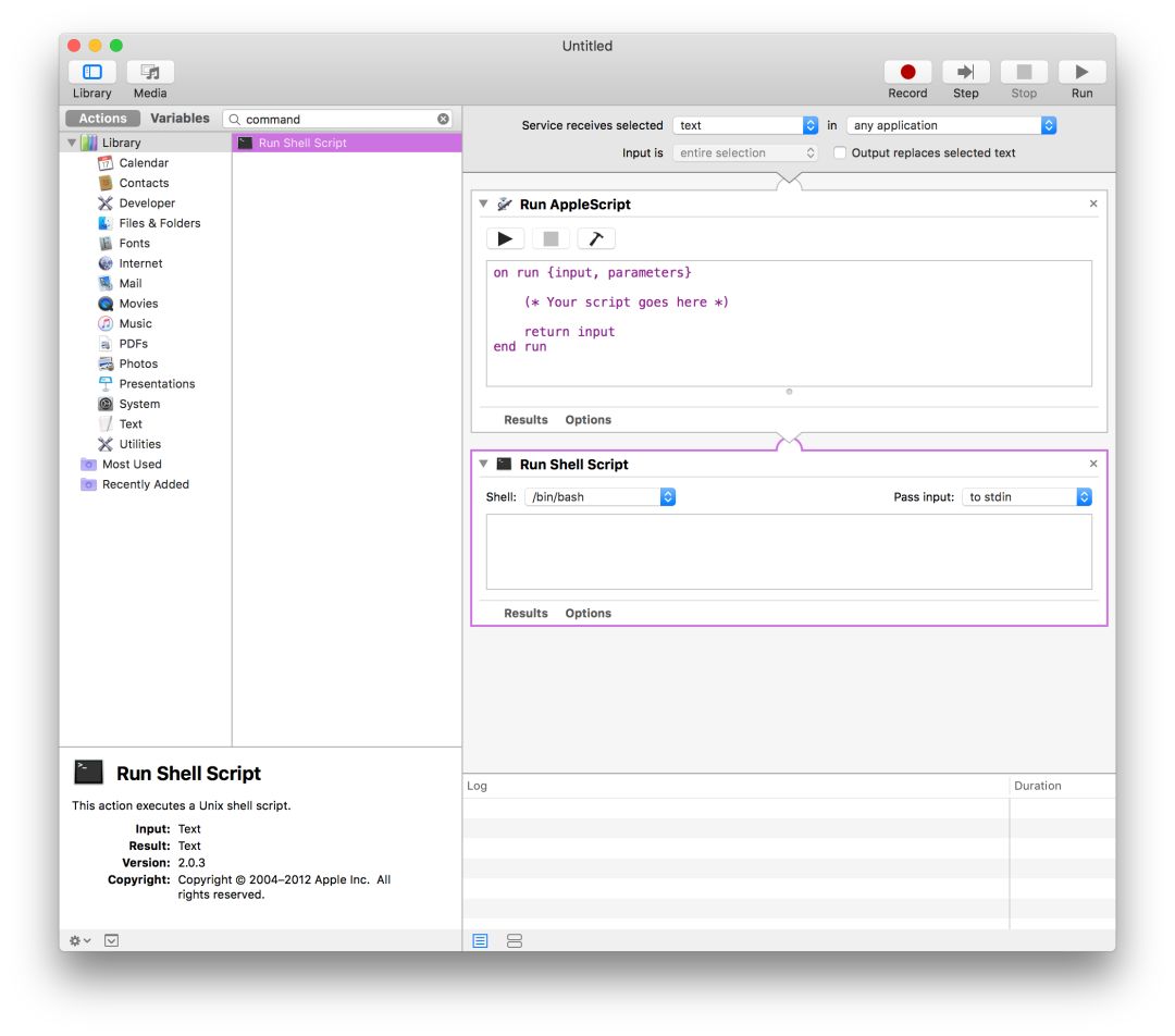 首先通过 Spotlight Search 启动 Automator,启动之后选择创建 Service。之后可以看到所以支持的 action,选择 Run AppleScript 并拖动到右侧的 workflow 区域,即可执行某个 AppleScript 了。当然也可以拖动 Run Shell Script 到 workflow 区域,各个 action 之间可以通过 stdin 传递数据。如下图所示: