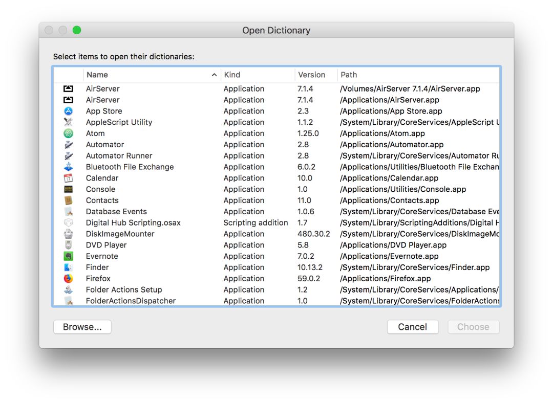 如何编写 AppleScript 呢?Mac 自带脚本编辑和运行工具,通过 Spotlight Search 搜索 Script Editor 即可。运行 Script Editor 之后,通过菜单 File -> Open Dictionary 即可打开如下图所示一个文档,里面列出来所有支持 AppleScript 的 App,以及各个 App 所支持的接口调用。