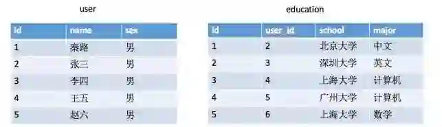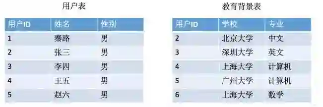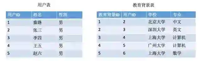 上面就是两张表,用户和教育背景,看上去能够使用姓名进行匹配,可是这里出现了两个张三,一个是北京大学,一个是上海大学,究竟哪个张三才能和用户表的张三对应上?都不能。