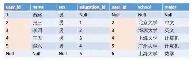 上图就是正确的用法,用户表和教育表能够通过ID联接,可能有人疑问,用户ID为1和6的,还是不能对应呀?这个不要紧,因为在数据库中,不是所有的表都能一一对应,存在部分匹配的可能性,也许那个叫秦路的,他没读过书,教育背景表中自然没有记录了。