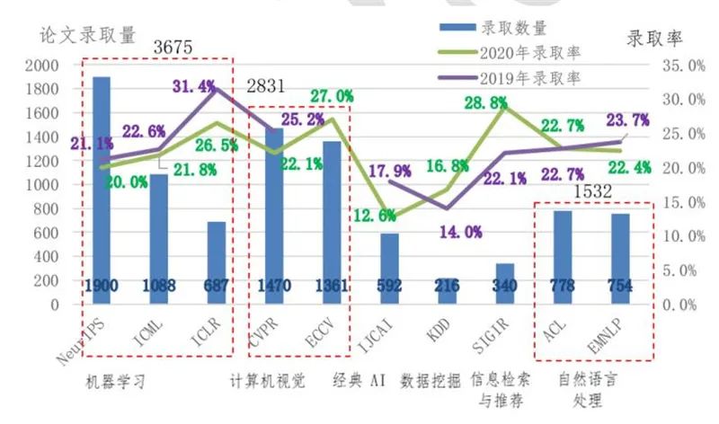 人工智能几个重点子领域顶级国际学术会议 2020 年的论文录取情况