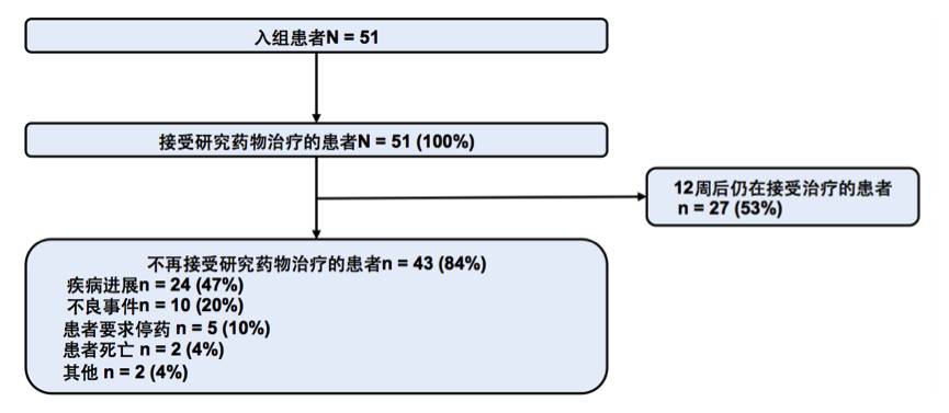 共入组51例患者,中位年龄61岁,EGFR T790M阳性、阴性和状态未知的患者分别为23例(45%),23例(45%)和5例(10%)。本研究的最后随访日期为2017年8月21日,患者目前的治疗情况总结见下图。