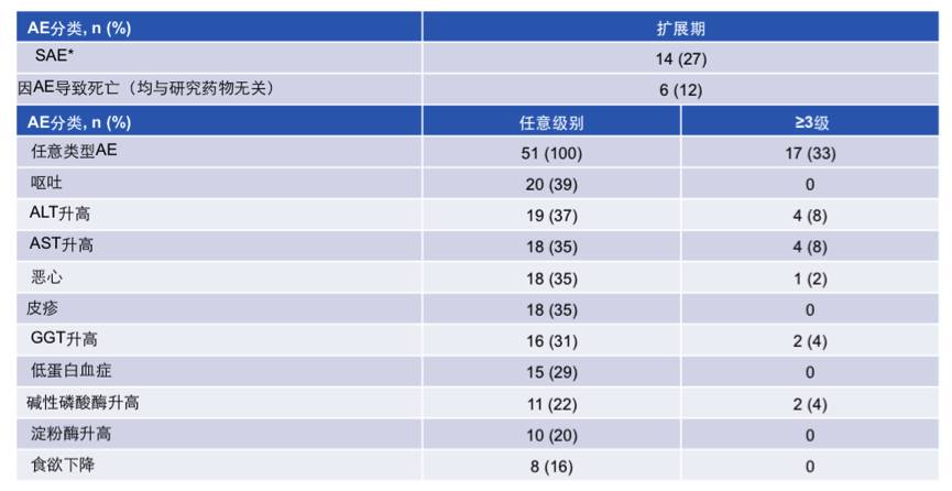 安全性分析:最常见的(≥10%)AE总结见下表,≥3级的AE发生率为50%。最常见的AE为恶心,呕吐,食欲减低,乏力和皮疹。