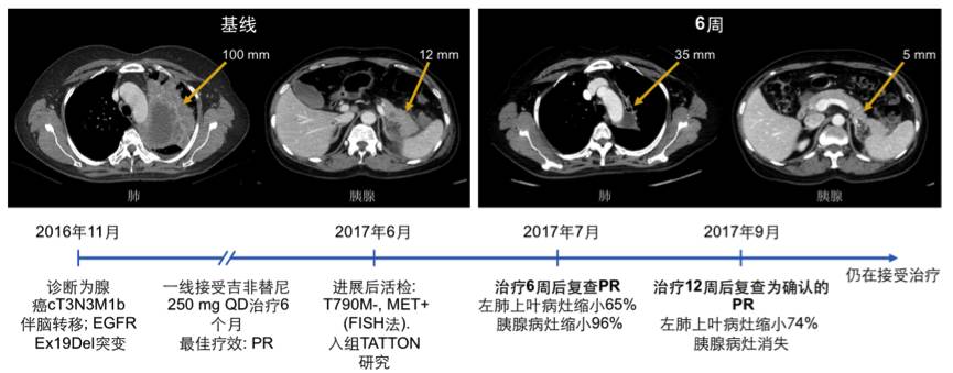 研究者还报道了1例接受联合方案治疗取得PR的病例。57岁女性,非吸烟肺腺癌患者,ECOG PS评分1分。2016年11月诊断为肺腺癌cT3N3M1b伴脑转移; EGFR Ex19Del突变,一线接受吉非替尼250 mg QD治疗6个月,最佳疗效PR。2017年6月,进展后活检T790M-, MET+ (FISH法),入组TATTON研究。2017年7月,治疗6周后复查,疗效评价为PR(左肺上叶病灶缩小65% 胰腺病灶缩小96%);2017年9月,治疗12周后复查,疗效评价为确认的PR(左肺上叶病灶缩小74% 胰腺病灶消失),目前仍在接受治疗。影响学变化和病史总结见下图。