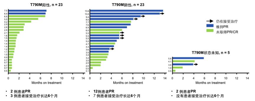 进一步分析联合方案治疗的持续时间,T790M阳性患者中,3例患者的治疗时间超过6个月;T790M阴性患者中,7例患者的治疗时间超过6个月。