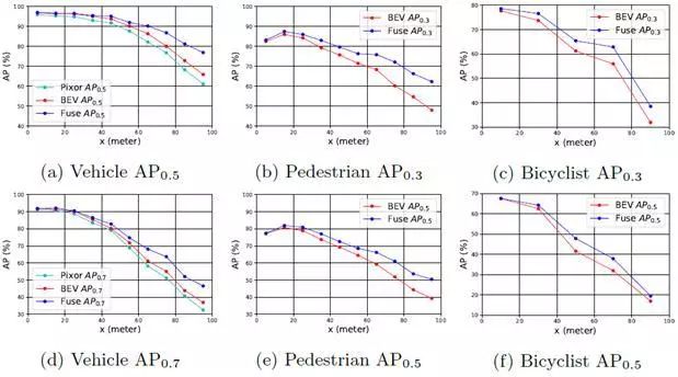 通过对以上三个类别计算基于距离的piecewise AP(图3),说明连续融合模型在远程检测中能获得更多增益。
