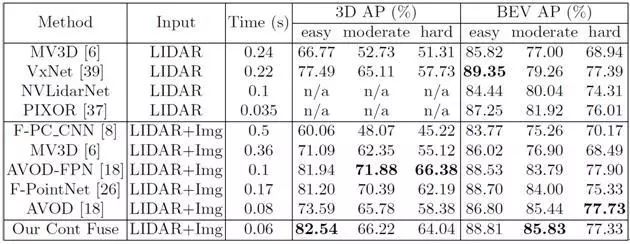 3、在TOR4D数据集上评估多类别BEV目标检测,如表3所示。将连续融合模型与BEV基准以及最近的基于LIDAR检测器的PIXOR进行了比较,其在所有类别上明显优于其他两种基于LIDAR的方法。