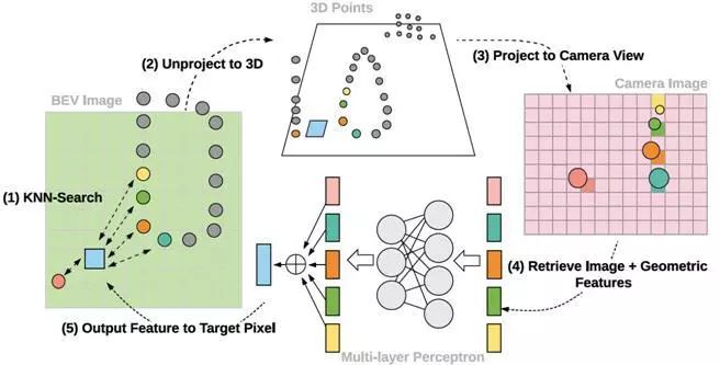 1、 连续融合层:在BEV图像上给定目标像素,首先提取K个最近的LIDAR点。然后将3D点投影到相机平面,检索对应的图像特征。最后将图像特征和连续几何偏移输入到多层感知器(MPL)中,以生成目标像素的特征。整个计算过程如图2所示。
