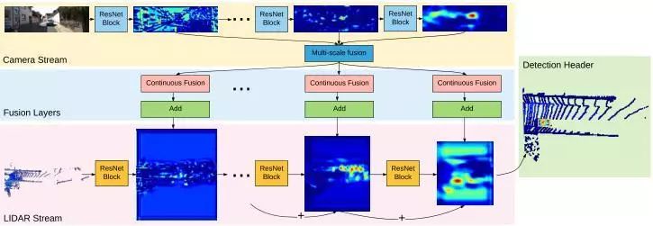 总体架构包括两个流(图1),一个流提取图像特征,另一个从LIDAR BEV中提取特征。为了实现多传感器多尺度融合,使用连续融合层来桥接两侧的多个中间层,并在BEV空间生成最终检测结果。
