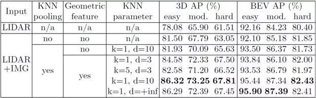 2、连续融合有两个组件,使得图像与LIDAR之间能够稠密精确融合。第一个是KNN polling,它通过稀疏的相邻点来收集稠密BEV像素的图像特征输入。第二个是输入到MLP的几何特征,它补偿两个模态匹配位置对之间的连续偏移。如表2所示,将连续融合模型与仅LIDAR模型(LIDAR输入),稀疏融合模型(无KNN pooling),离散融合模型(无几何特征)进行比较,证明了KNN pooling插值的重要性。