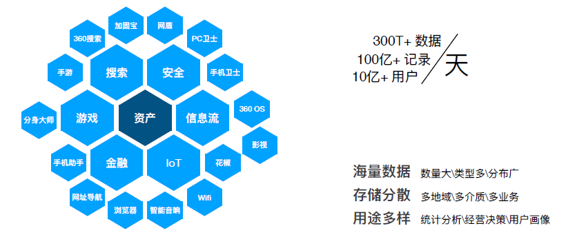 从图中可以看到,公司内业务方向主要分为搜索、安全、视频信息流、游戏、金融和 IoT 六个领域,以这些领域为核心由向外衍生出诸多产品,这些产品每日新增打点数据 300T+,换算后有接近 100 亿 + 条记录,覆盖用户数达到 10 亿 +。由于业务对数据的使用场景在时延和量级上有不同的需求,所以数据往往分散存储在诸多存储介质上,在进行数据产出时需要抽取合并不同介质的数据,以公司内部场景为例。