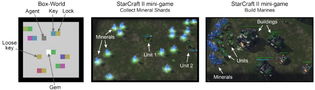 图 1:「方块世界」和「星际争霸 II」任务要求对实体及其关系进行推理。