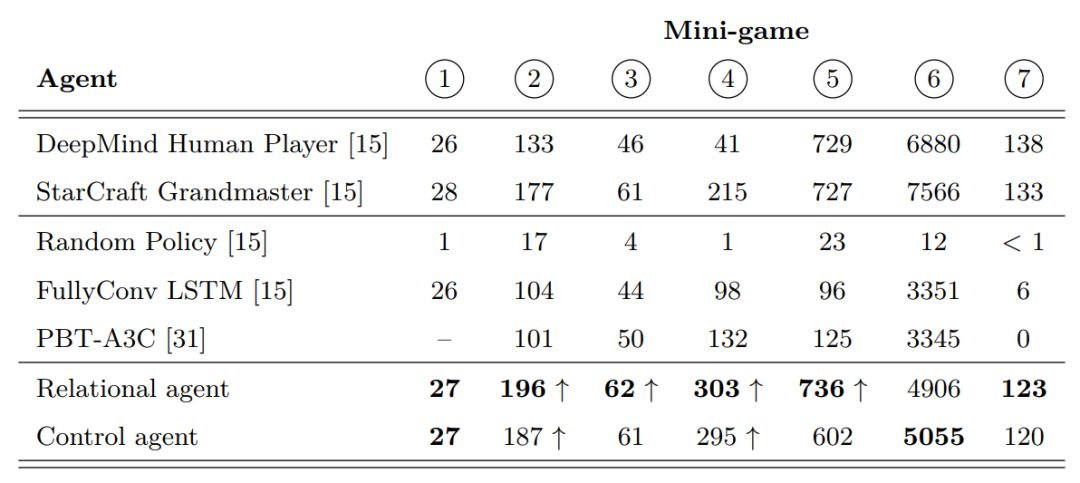 表 1:「星际争霸 II」迷你型游戏中使用全动作组的平均得分。「↑」表示高于大师级人类玩家的分数。小游戏:(1)移动到信标位置;(2)收集晶矿碎片;( 3 ) 发现并打败小狗;(4)打败蟑螂;(5)打败小狗和毒爆虫;(6)收集晶矿和气矿;(7)制造机枪兵。
