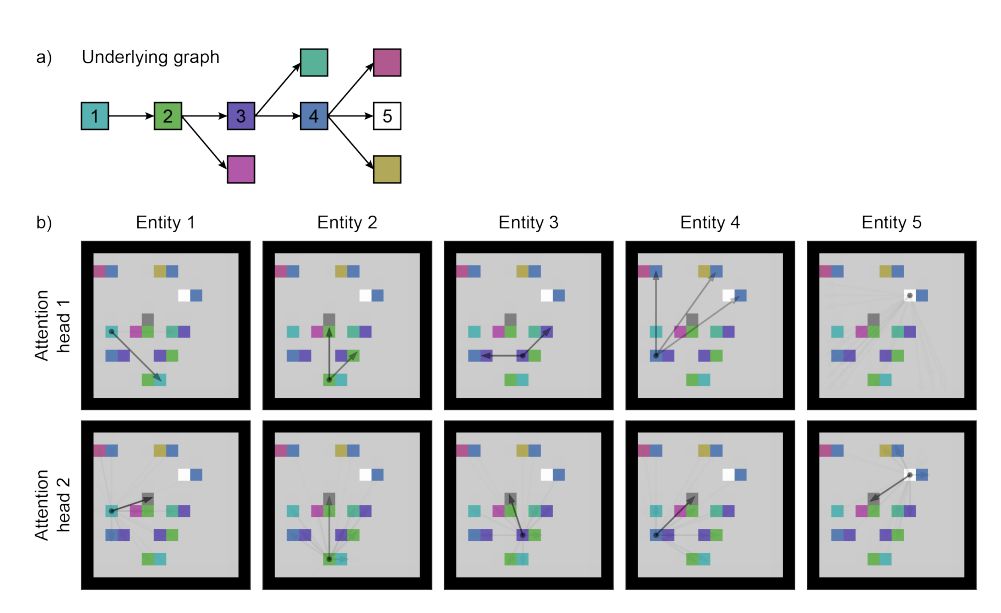 图 4:注意力权重可视化。(a)单样本水平的基本图;(b)该水平上的分析结果,使用解决路径(1-5)中的每个实体作为注意力源。箭头指向源正注意的实体,箭头的透明度由相应的注意力权重决定。