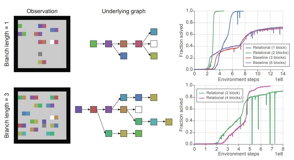 图 3:「方块世界」:观察值示例(左),决定实现目标合适路径的基本图结构及任意干扰分支(中间)和训练曲线(右)。