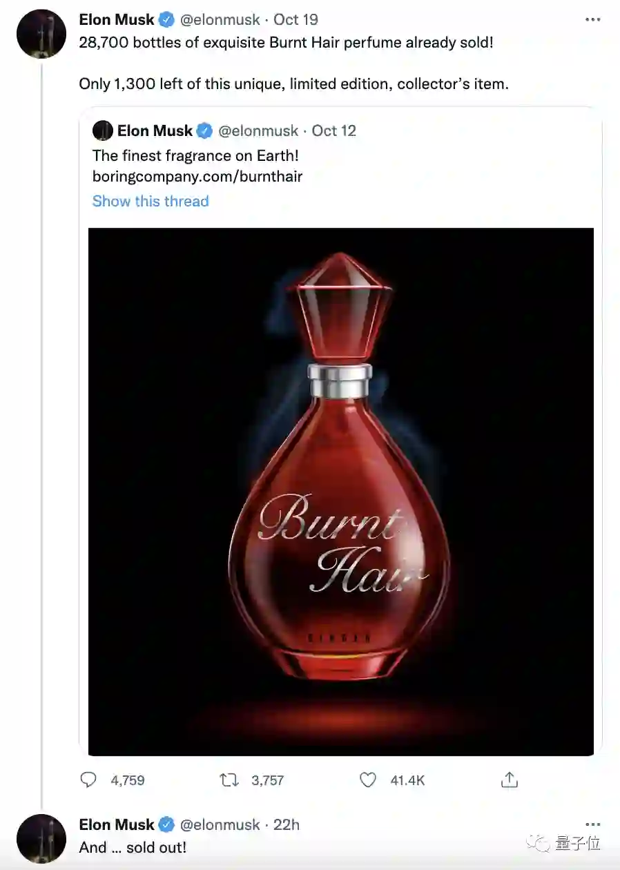 “香水博主”马斯克发博称,3万瓶“烧焦的头发”(Burnt Hair)已经售罄了!