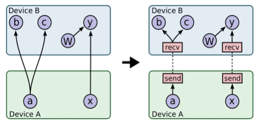 原生 TensorFlow 中异步训练中,使用的 Send/Recv Op 进行跨节点的 Tensor 传输,其中 Recv 节点对应一个 RPC 请求来传输一个 Tensor,即使有 Recv Ops 输出到相同的目标 Op。而且每个即使接收到的张量是标量,Recv 节点也会触发一个 RPC 操作。如图: