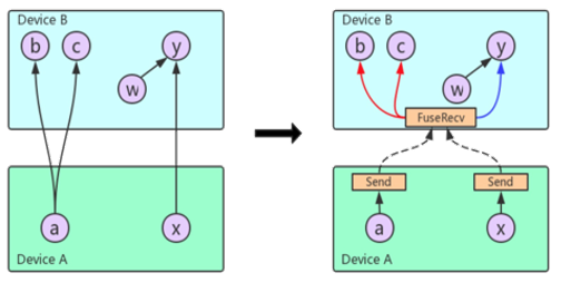 如图所示,相比原生 TensorFlow 中 a, x 需要两个 Recv 节点进行两次 RPC,FuseRecv 节点会包含两个 slot,通过一次 RPC 将 a, x 从 Device A 中的 Rendezvous 中获取。