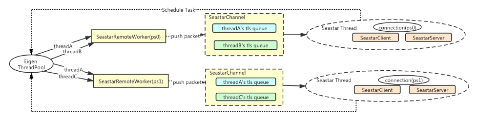 我们基于 Seastar 的设计特点,在通信收发链路的设计中延续了 Share-nothing 的设计,在完整的通信收发链路中整个流程通过 tls 实现了多线程的 share-nothing,并且基于 Message-Passing By Queue 的方式和外部的 TensorFlow 工作线程进行交互。