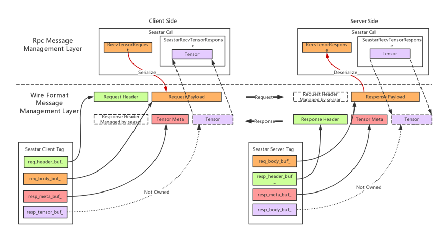 grpc+seastar 的 Request 及 Response 均由定长的 Header 附带一段或多段 Payload 组成。Header 与 Payload 可以独立的进行内存分配,并按照给定的顺序发送,从而在网络上形成完成的报文字节流。