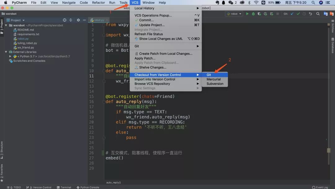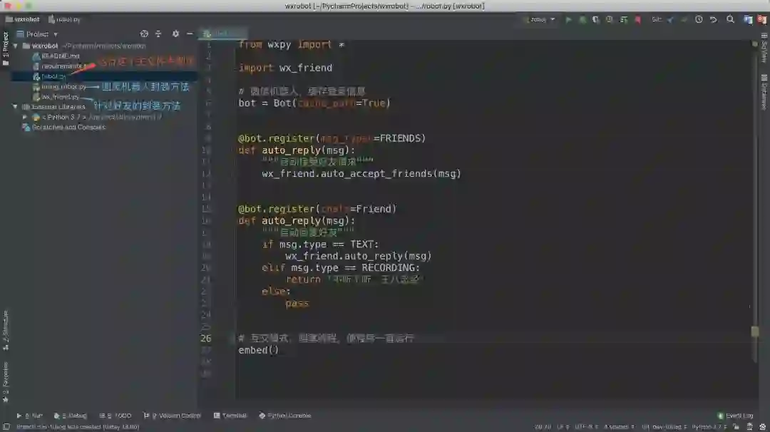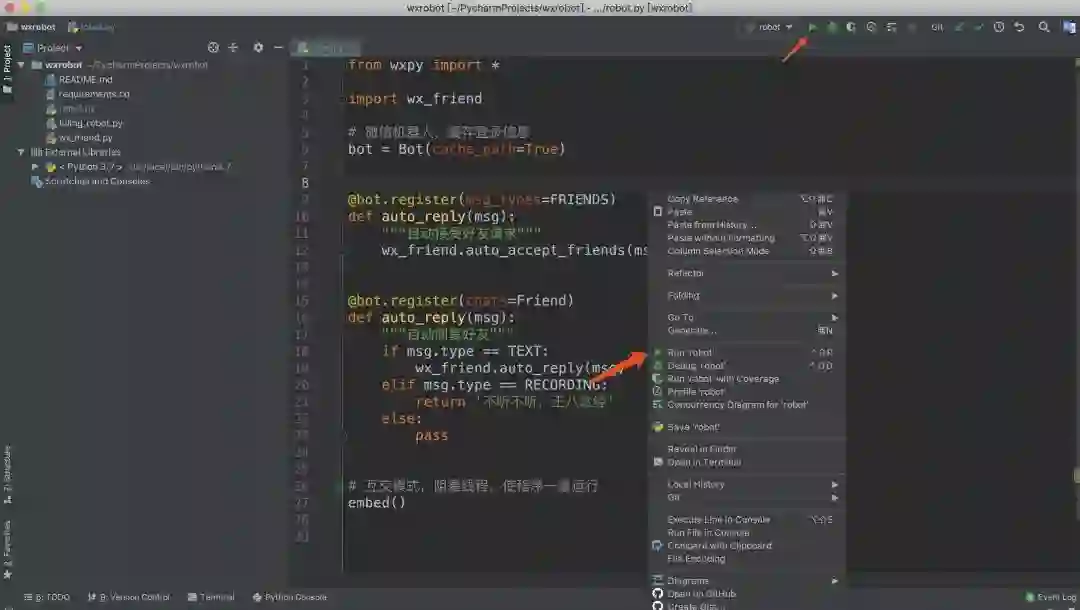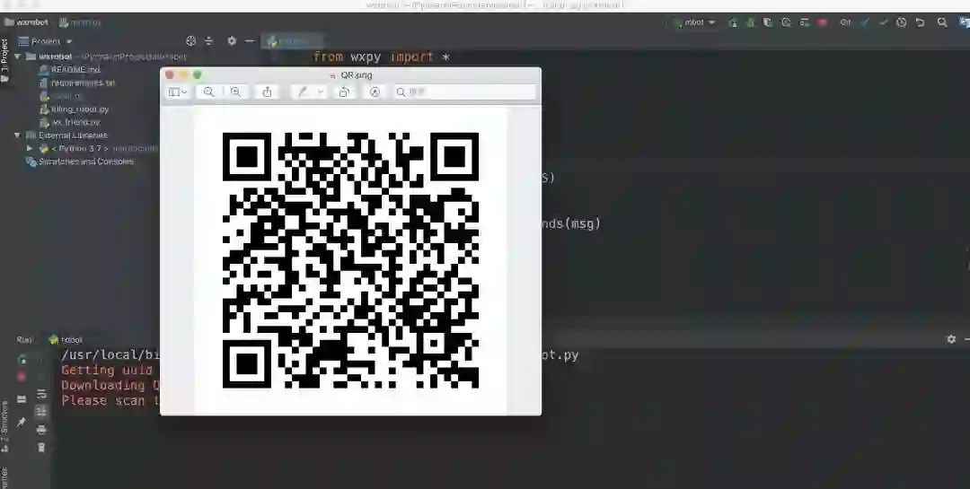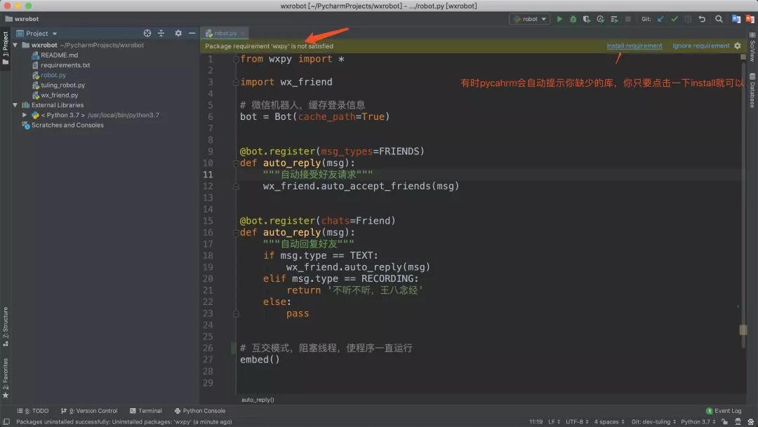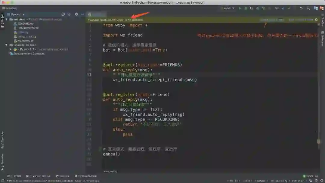 项目下载下来之后,因为没有安装必须的库wxpy,pycharm可能会有如下提示,这时我们点一下install就可以。