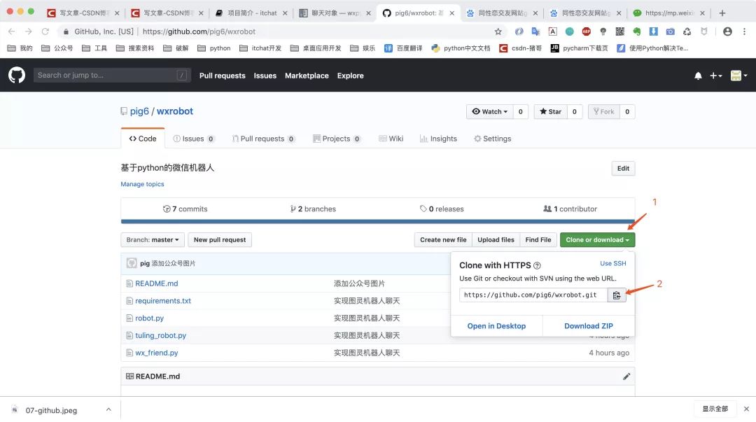 首先找到你需要下载的项目,然后点击Clone or download,然后点击右侧的复制按钮,猪哥这个项目的地址是:https://github.com/pig6/wxrobot(或点击阅读原文)