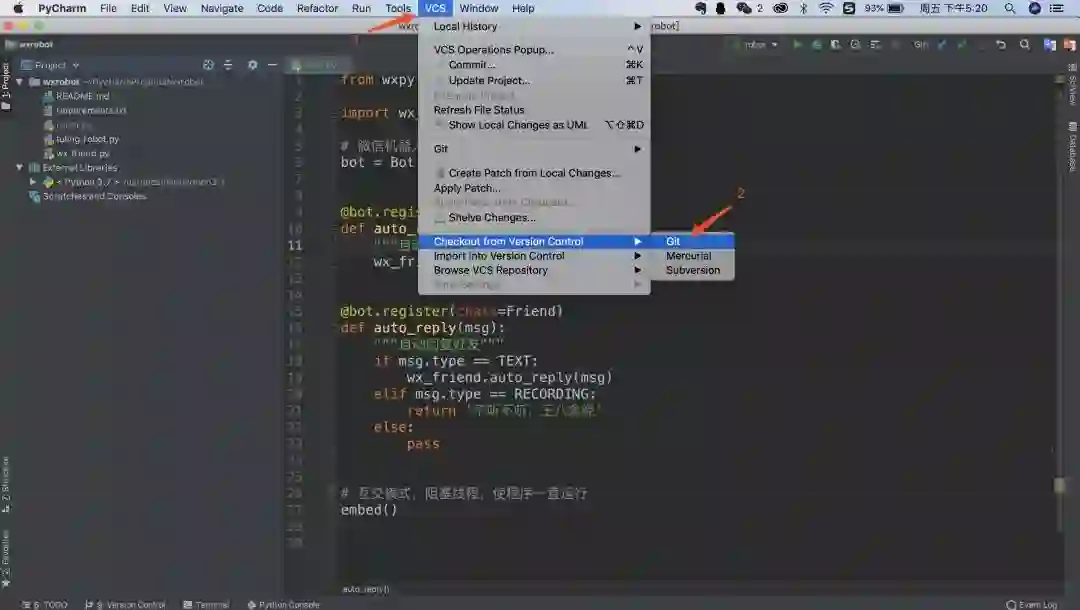 然后打开你的pycharm,选择CSV->Checkout from version control->git,然后粘贴刚才复制的项目链接。
