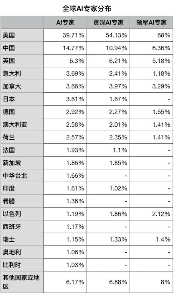 根据上表可知,在全球人工智能专家中,中国的AI专家数量位居第二,但是在资深人工智能专家和领军人工智能专家占比数量上来看,美国占比多于全球其他所有地区专家数目的总和。而中国在这方面,与美国的差距仍然很大。