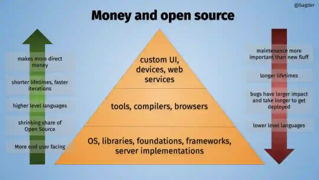 越往上走,产品更多是面向终端用户,企业能赚更多的钱,同时产品迭代更快、语言要求层次更高,开放源码的份额也不断减少。在最上面,很多东西已经不是开源的了。反之,越往下走,产品使用寿命更长,语言要求不好,但 bug 的影响更大,修复需要的时间更长,因此维护比重构更重要。在最底部,几乎所有的东西都是开源的,每个组件都被无数的用户所依赖。