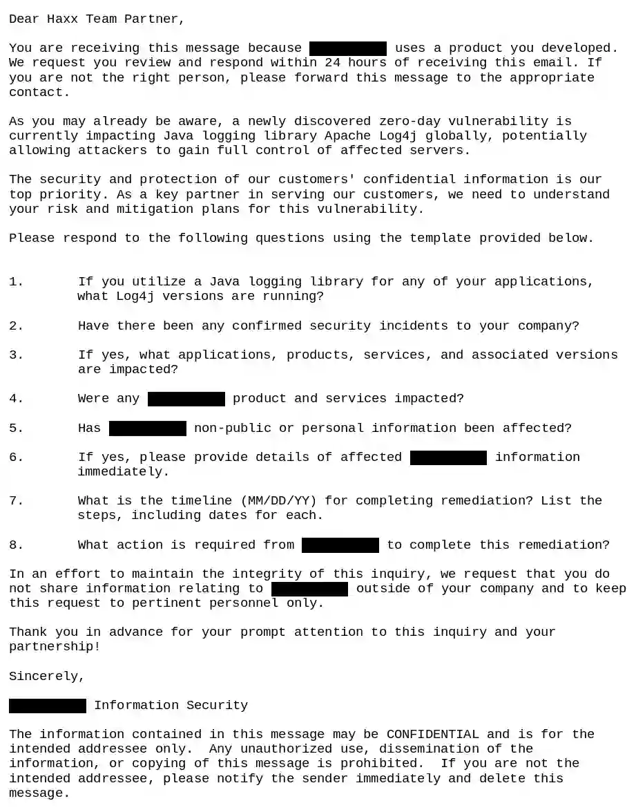 根据公开的邮件内容,这家《财富》500 强企业(暂且称为“NNNN”)将 Daniel 团队当成了产品供应商,并要求其 24 小时内免费提供关于 Log4j 漏洞的解决方案。下面是 NNNN 要求 Stenberg 回答的问题: