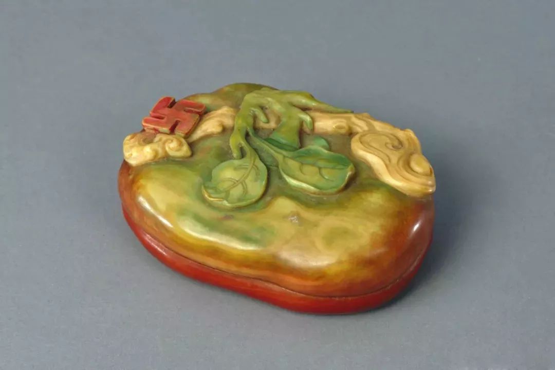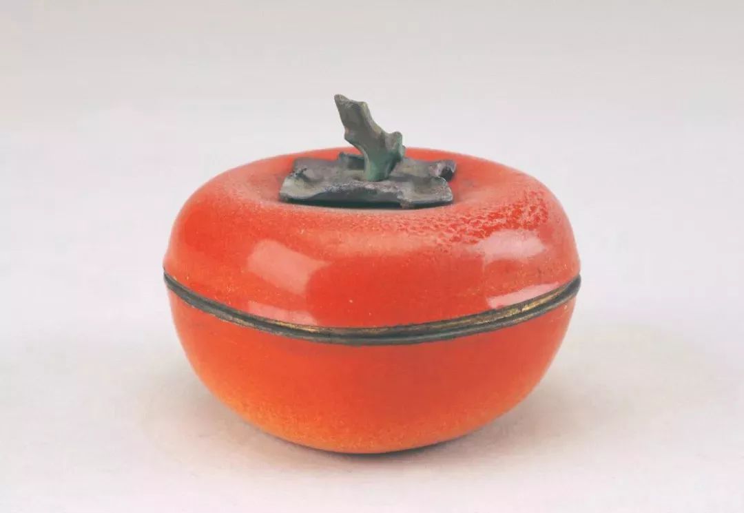 专门模拟柿子形态的藏品也有不少,如画珐琅红色光素柿形盒,釉色模仿深浅渐变,圆胖饱满。