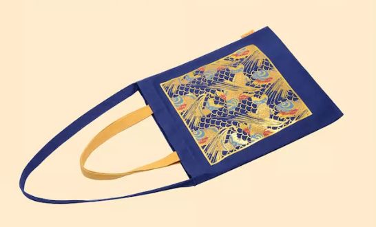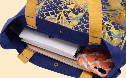 故宫文创·祥瑞主题帆布袋创意同样来源于故宫博物院藏品——杏黄色地松鹤纹织金锦和印彩鲤鱼海水纹布。它以优质16安帆布材质制作,手感柔韧结实。