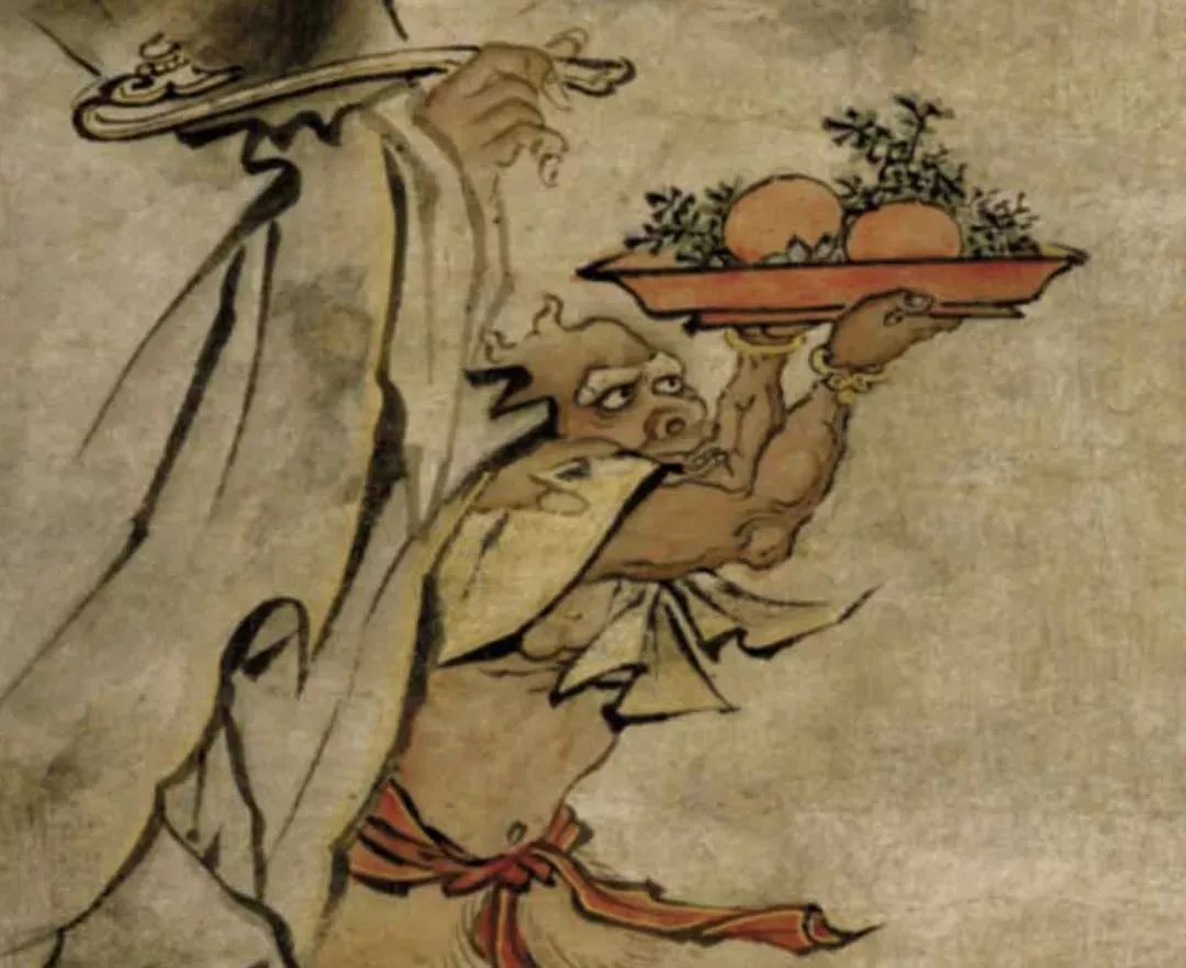 也就是说,这是一幅皇帝御笔的人物画:画中的钟馗,犀利的目光紧盯着飞来的蝙蝠,一手持如意,一手扶在小鬼的肩头;小鬼双手捧着盛有柿子和柏枝的托盘,寓意“百事如意”。