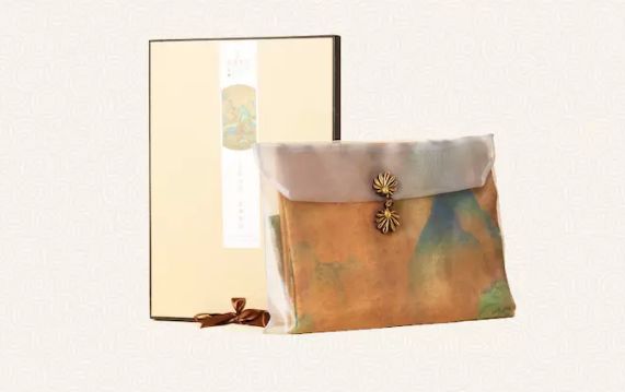 设计师在《千里江山图》原作基础上,根据现代人的审美提取局部进行设计,在构图上绵延千里的高峰巨嶂和平波镜湖,以上下呼应的方式在丝巾上重现,展示出独具中式美学的视觉之美。