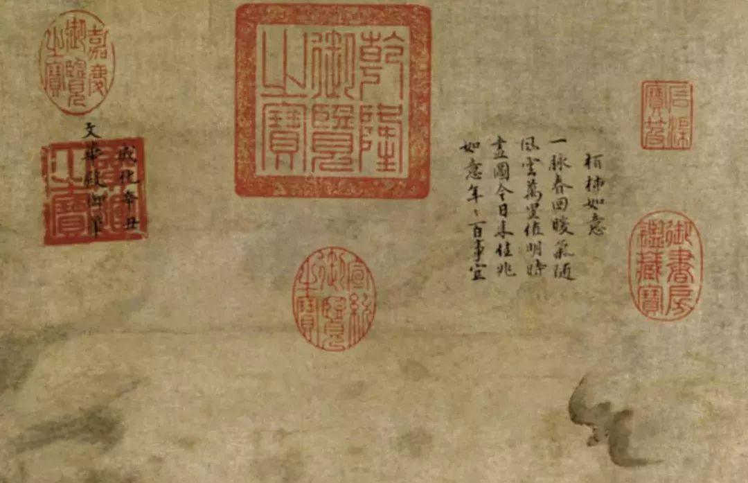 画幅右上方有朱见深本人的御题:“柏柿如意”,点明此幅画的主题“百事如意”。诗曰:“一脉春回暖气随,风云万里值明时。画图今日来佳兆,如意年年百事宜。”