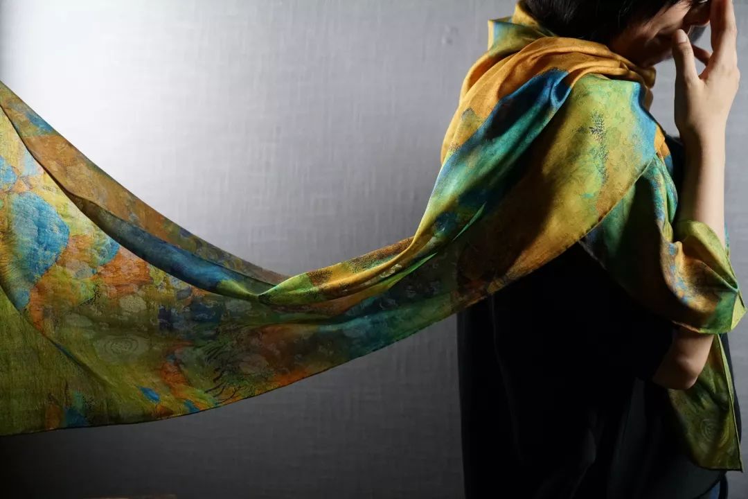 宋代王希孟《千里江山图》被视为青绿山水画中的杰出之作。当《千里江山图》遇见“缠枝牡丹纹花罗(丝绸)”,就是故宫文创•千里江山艺术长巾。