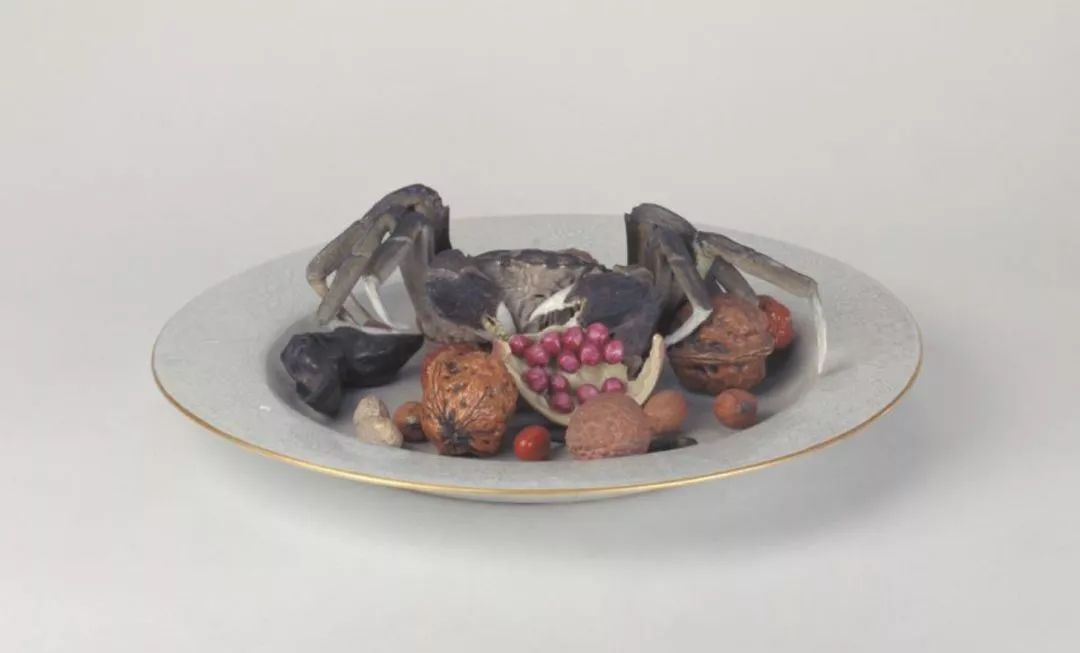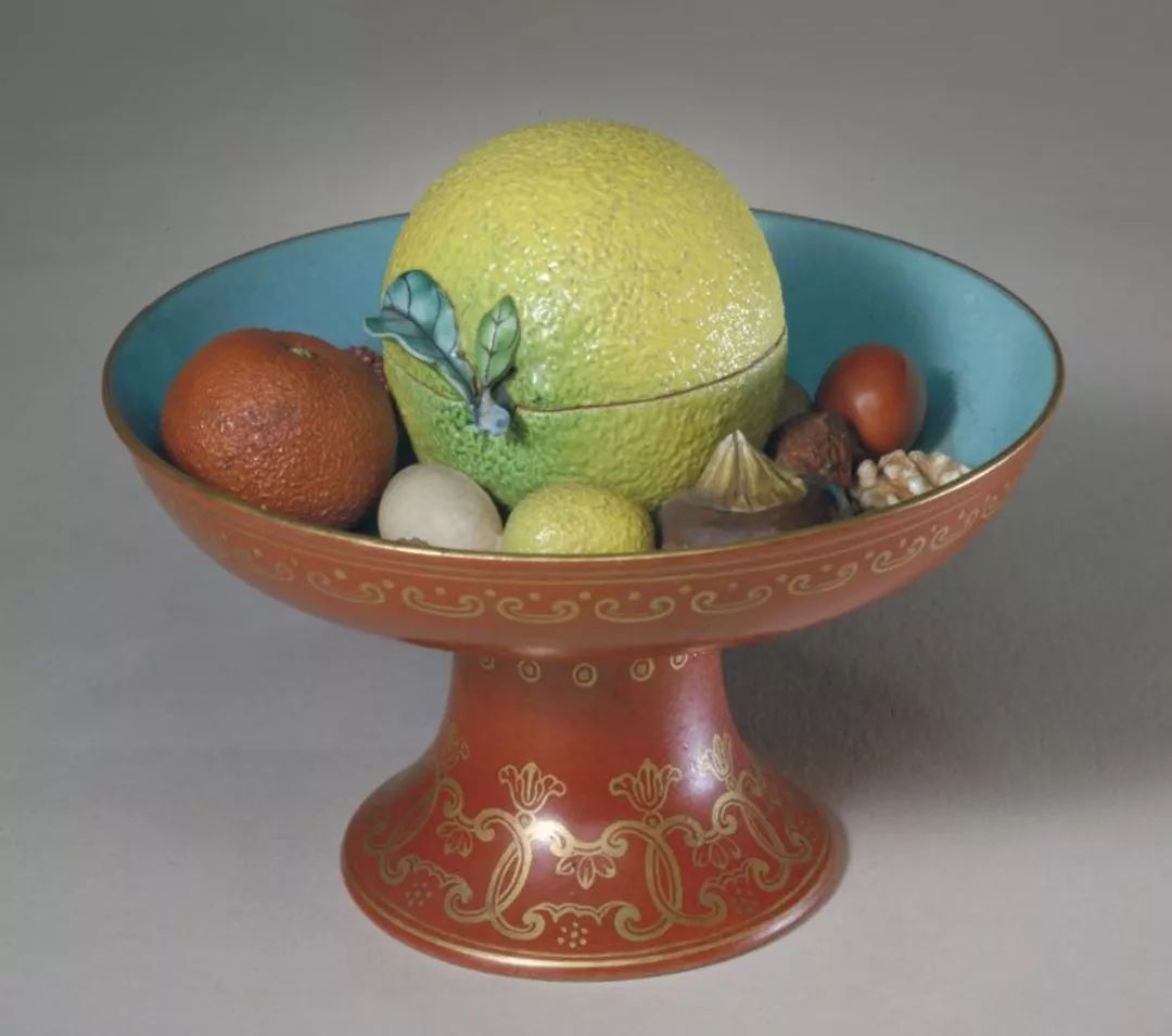 如粉彩像生瓷果品盘,螃蟹石榴核桃等生鲜瓜果置于一盘,栩栩如生。