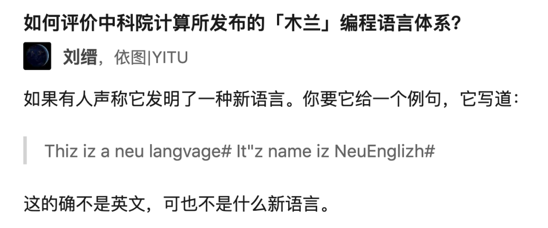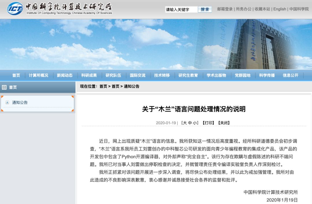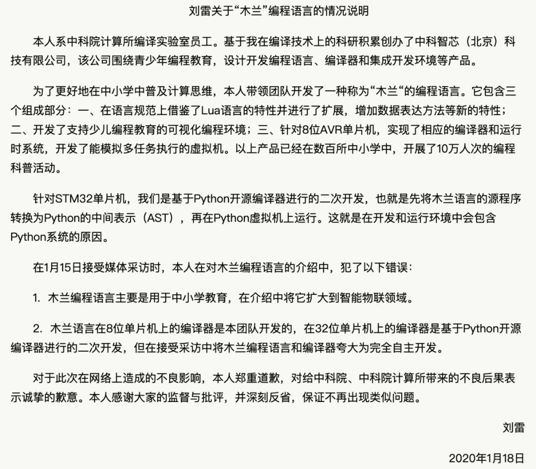 内容提要:1 月 15 日,中科院计算所发布国产编程语言「木兰」,令很多人为之一振,纷纷试用。结果,很快就有开发者质疑它只是「换皮 Python」。面对质疑声,项目负责人刘雷已经发布情况说明,并对自己的夸大行为进行道歉。目前,他已被停职检查。