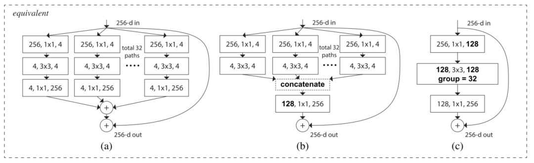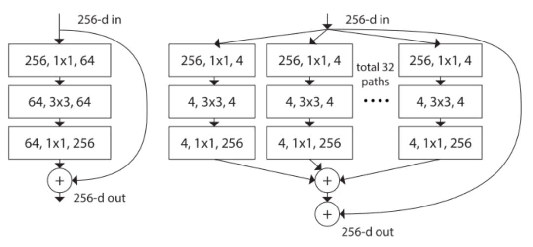 左:[2] 中 ResNet 的构建块;右:ResNeXt 的构建块,基数=32